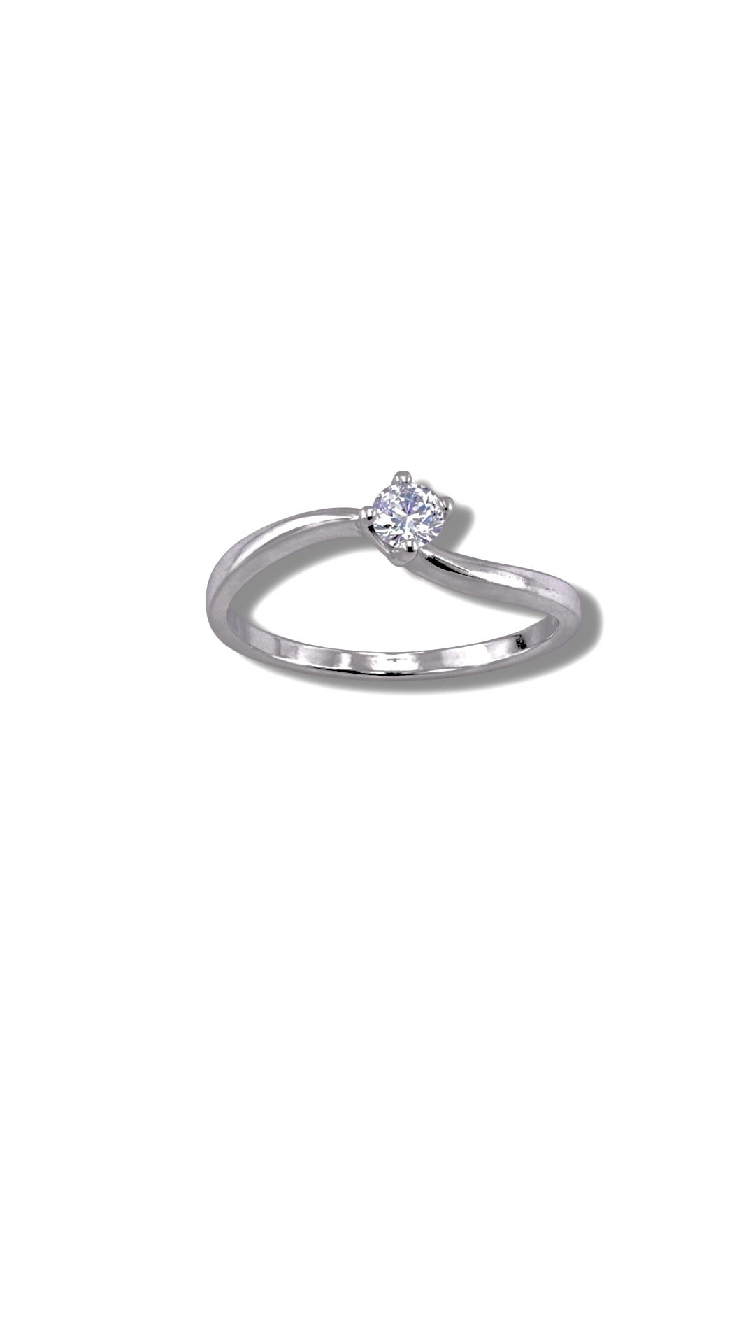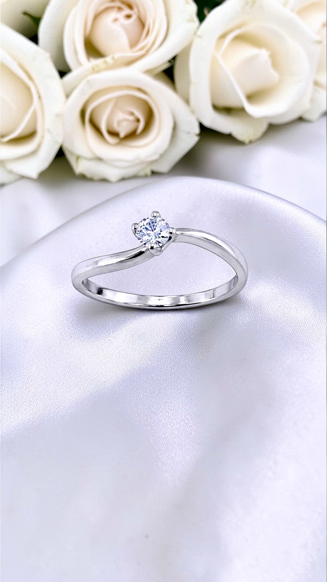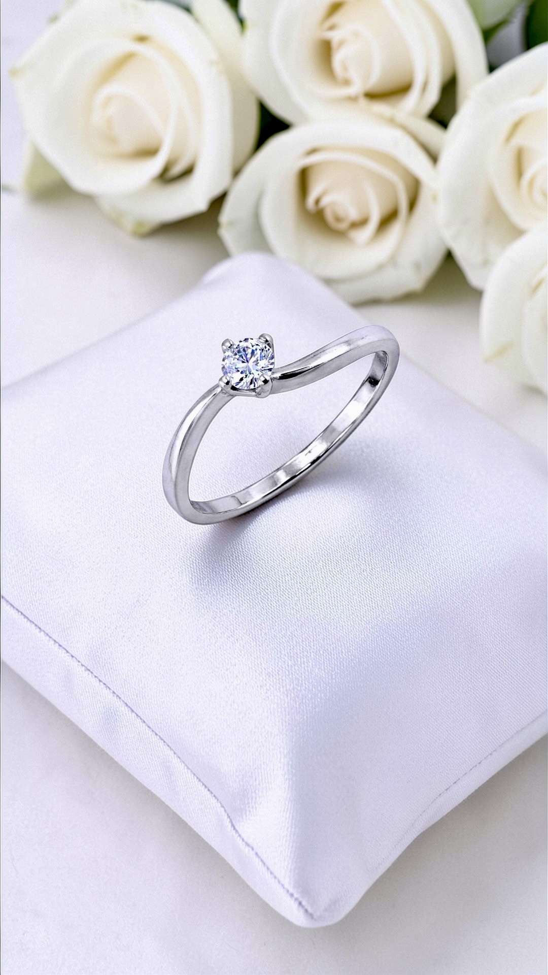 Ez az elegáns egyköves gyűrű egy 3,25 mm-es fehér cirkónia kővel készült, amelyet négy karmos foglalat tart biztosan.