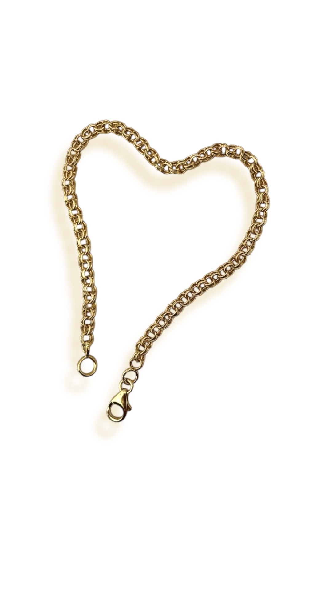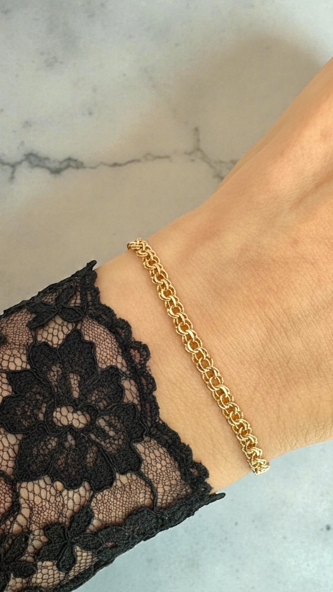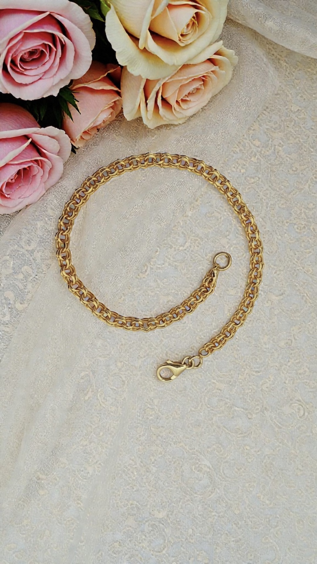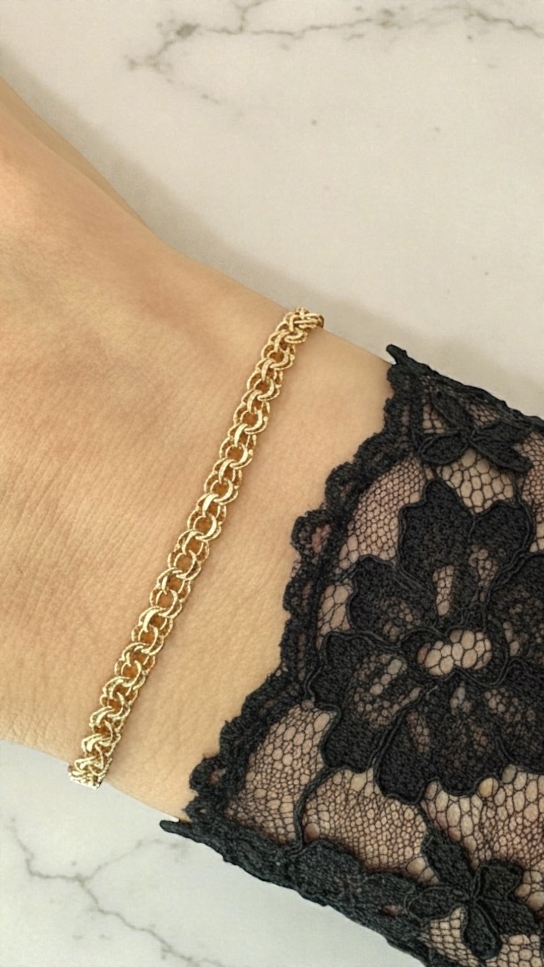Ez a tömör, kézzel készült Garibaldi karlánc a precíz kidolgozásnak köszönhetően kifinomult és látványos megjelenést biztosít. Kb 3,5 mm széles és kb 1,4 mm vastag kialakítása erőt és eleganciát sugall, miközben kényelmes viseletet nyújt.